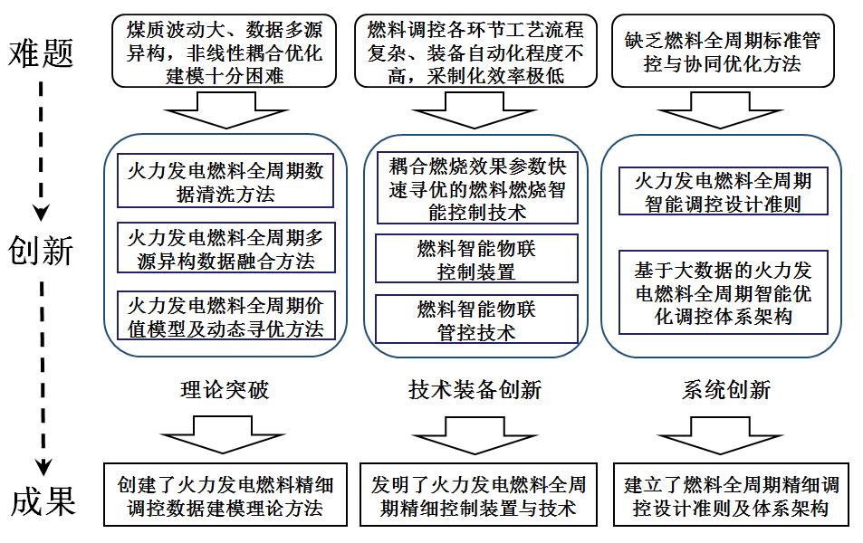 2020年两会政府工作报告指出:推进煤炭清洁高效利用,同时进一步降低一般工商业平均电价。因此,确保燃煤火力发电机组清洁、安全、高效运行的同时,降低占企业总成本70%以上的燃料成本已成为火力发电企业可持续发展的必然选择。本技术围绕火力发电燃料全周期这条主线,针对燃料精细调控全过程的关键理论与技术难题,创建了火力发电燃料精细调控数据建模理论方法;发明了火力发电燃料全周期精细控制装置与技术;建立了燃料全周期精细调控设计准则及体系架构;研发了火力发电企业燃料全周期智能优化平台,实现了火力发电企业燃料“购-输-烧-排-售”全周期的智能精细调控。