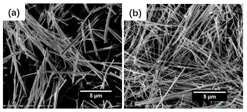 图1 (a) 500 r/min 与(b) 1000 r/min的搅拌水热工艺制备的BaTiO3纳米线的SEM形貌图