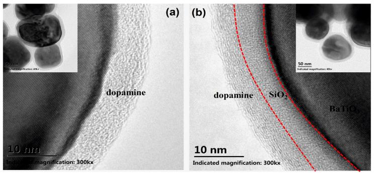 图2 高介电纳米颗粒表面改性,多巴胺修饰SiO2@BT的透射电子显微图