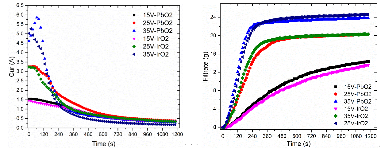 图6显示从废铅膏回收料制备二氧化铅阳极与课题组自制的高效IrO2涂层阳极对比电解污泥脱水性能??梢钥闯龆弑硐殖隽私咏牡缃馔阉阅?/span>。