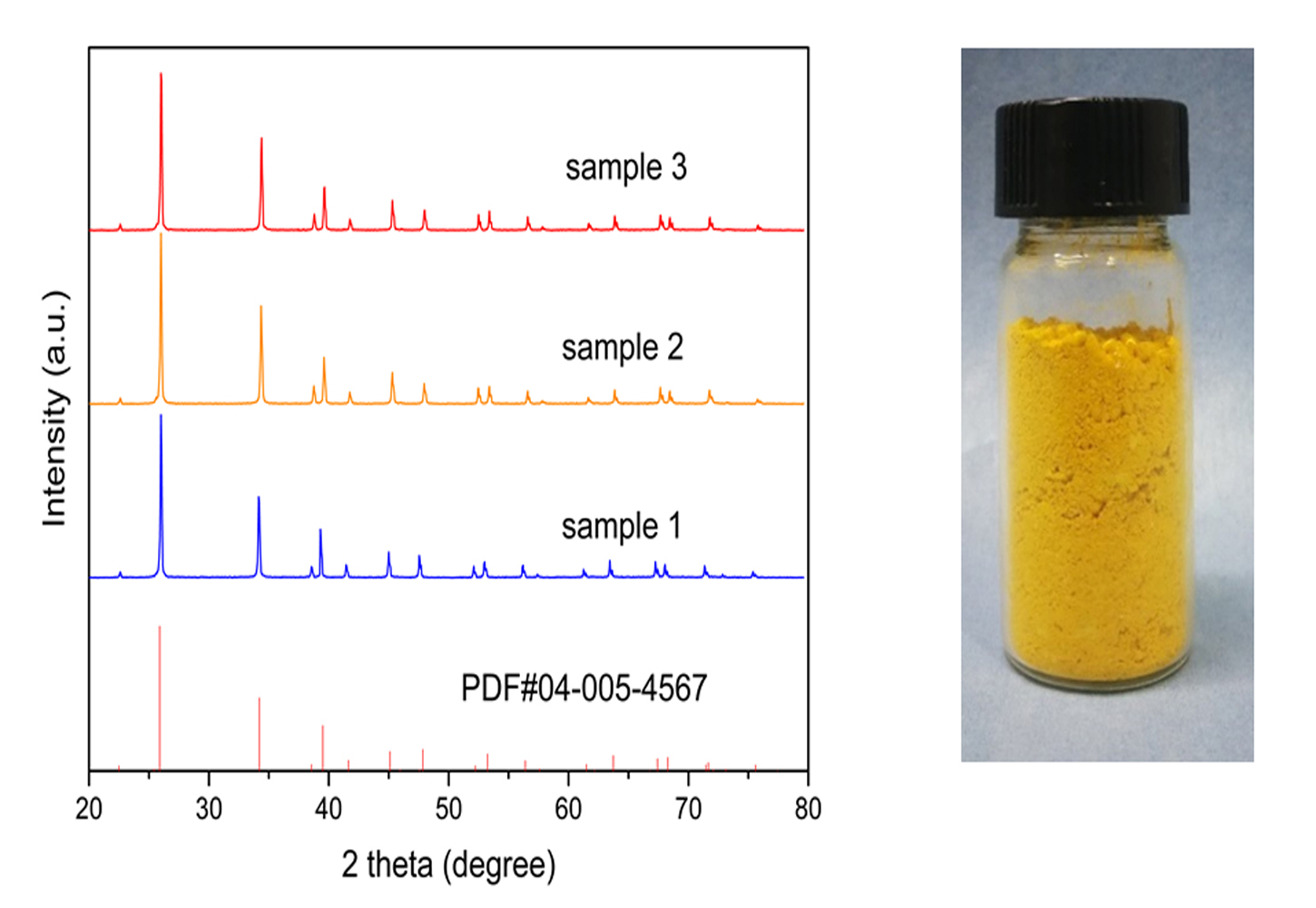 图2 废铅膏回收制碘化铅的实物图与XRD图