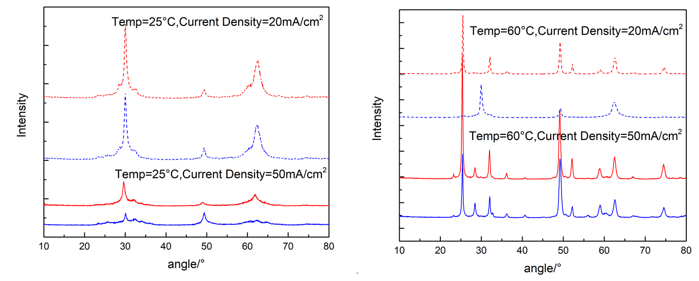 通过X射线衍射仪分析经废铅酸电池铅膏回收制备的钛基二氧化铅DSA阳极材料的晶形结构如图4所示,可以看出,从纯铅电解质和从回收铅电解质得到的二氧化铅表现出相同的晶形结构。