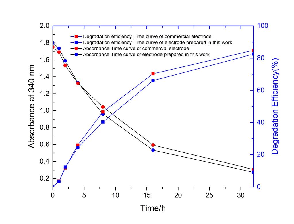 将从回收铅制得的钛基二氧化铅阳极与市面上购买的钛基二氧化铅阳极进行性能测试对比对H酸进行高级氧化,发现二者表现出接近的性能。