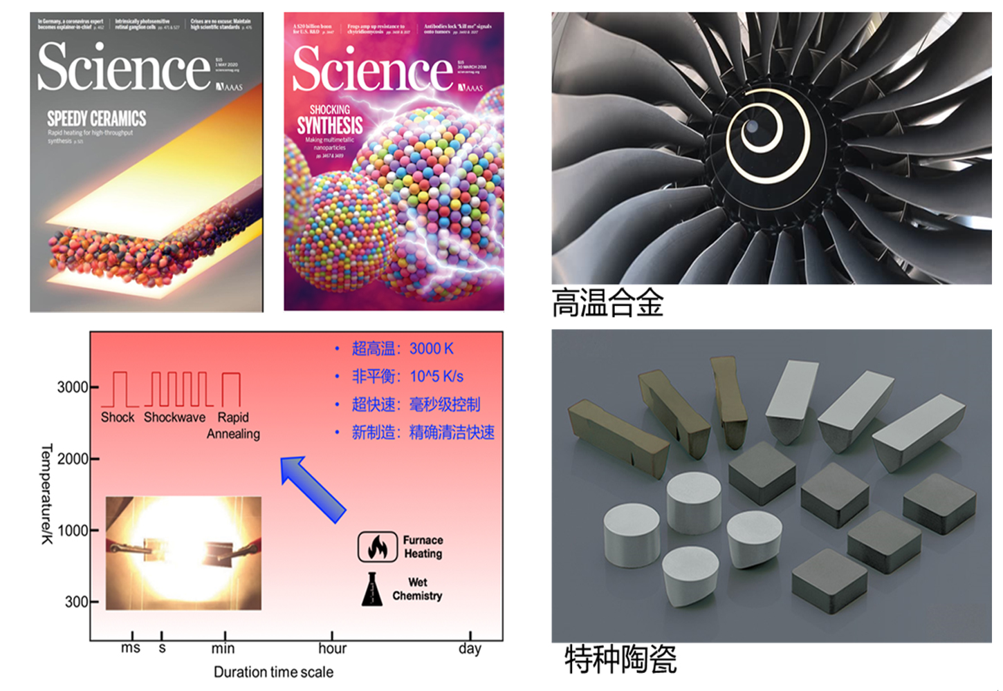 本成果开发了新型高温合成与制造技术(Science 2018, 359, 1489–1494; Science 2020, 368, 521–526.),可以在毫秒级时间内迅速升温到3000度左右,升降温速率在10,000度每秒钟,从而实现了极端高温和极端快速升降温情况下开发新材料或者高温下快速制造材料,尤其适合于极端材料(比如高温合金、特种陶瓷)等材料开发。