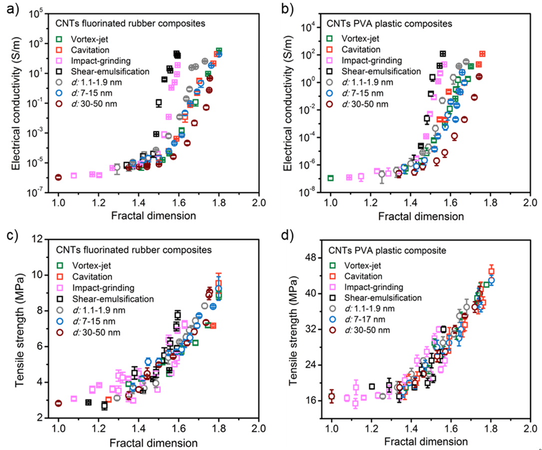 本成果基于碳纳米管微观形貌表征和电镜分形维数计算,研发了一种碳纳米管界面的数量和均匀度(即界面空间填充程度)评估方法,首先,实现碳纳米管分形界面空间填充程度的定量化表征。其次,基于该定量化表征方法阐明碳纳米管界面空间填充程度与聚合物基复合材料性能间的关系。结果表明,复合材料的电导率和机械强度分别随界面空间填充程度的增大呈指数和线性增加。这种对应关系建立起了界面空间填充程度和碳纳米管复合材料宏观性能间的直接联系,且该联系与生产过程中采用的碳纳米管分散方法、碳纳米管浓度、碳纳米管类型以及复合基体无关。本成果普遍适用于碳纳米管复合材料的宏观性能评估,也可推广至各类纳米填充复合材料,对于指导纳米填充复合材料的制备具有十分重要意义。