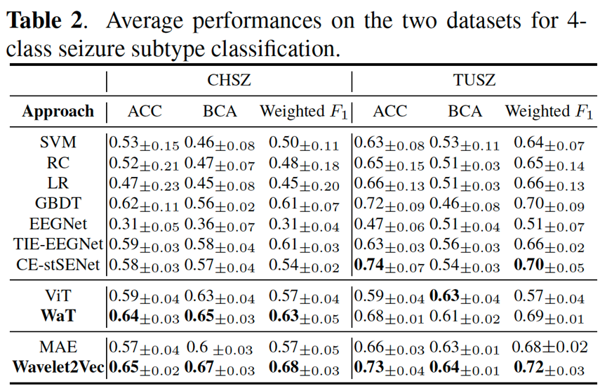 在自己采集的武汉儿童医院癫痫亚型分类数据集上,所提出的TIE-EEGNet 癫痫亚型4分类均衡分类准确度57.5%,F1 0.615;Wavelet2Vec 癫痫亚型4分类均衡分类准确度67%,F1 0.68,均超过当时最优算法。