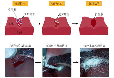 本成果中的止血粉末可通过配套的喷洒器直接喷洒于创面处,迅速覆盖创面;也可与腹腔镜集成,经由微创手术构建的腔道喷出,进而在创面上迅速吸收血液,促进红细胞的聚集、血小板的激活,止血粉末通过自凝胶形成一层与生物组织强韧粘附的水凝胶,实现封堵伤口、控制出血及抗术后粘连的目的。本成果中的止血粉末不完全依赖于内源性凝血系统,而是结合生化机制与力学机制,通过在出血部位形成物理屏障来阻止血液流动,具备独立于固有凝血级联和血液疾病的优势,确保了与生化策略的广泛适用性和兼容性。因此,本成果中的止血粉末可适用正常及凝血障碍患者的大出血场景中,在1分钟内控制出血,封闭创面,恢复受伤组织的生物力学,促进伤口愈合。