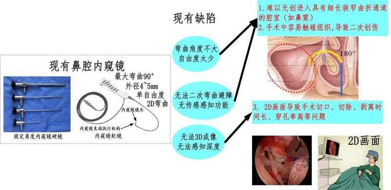 市场上手术及诊断配备的功能性鼻窦内窥镜大多为国外品牌,其中史托斯和奥林巴斯占领 50%以上的市场。工业和信息化部等十部门联合印发的《“十四五”医疗装备产业发展规划》中,强调“要重点突破医用内窥镜等影像诊断设备 的战略目标,推动国产高端内窥镜领域的技术发展”。目前已商品化的软/柔性耳鼻喉内窥镜主要应用于鼻腔、鼻道的检测,现有柔性电子鼻咽镜产品末端大多采用一个自由度,无传感感知功能,无法实现空间多自由度弯曲以及3D高清成像,存在如图1所示的缺陷,难以进入鼻窦。因此,研发具有我国自主产权的国产高端鼻腔内窥镜,具有重要的战略意义和实际应用价值。