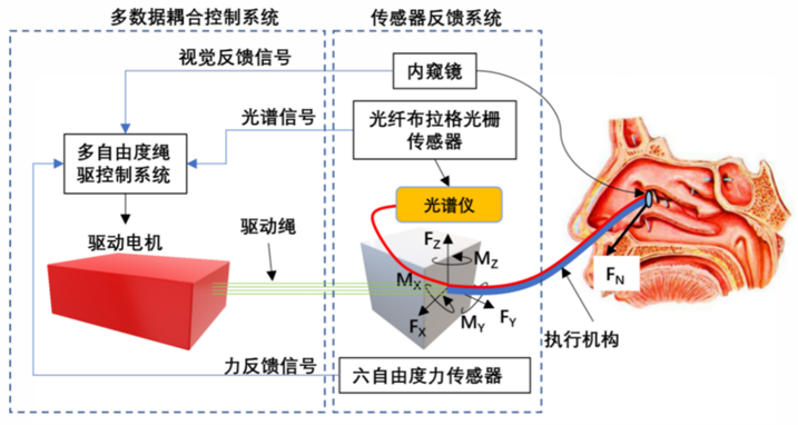 针对鼻窦柔性机器人系统和装配的传感器(包括电机上的力传感器,FBG内窥镜的图像信息等),设计传感器数据融合架构,从而获得高精度、鲁棒的、一致的末端位姿控制。针对当前单一控制算法精度有限的问题,研究基于驱动力及摩擦力和滞回补偿模型,结合基于FBG数据及内窥镜柔性驱动的运动学模型而得到的末端的位置以及视觉数据等信息,实现数据和算法耦合,提高控制算法的精确性、实时性和稳定性,多数据融合控制。
