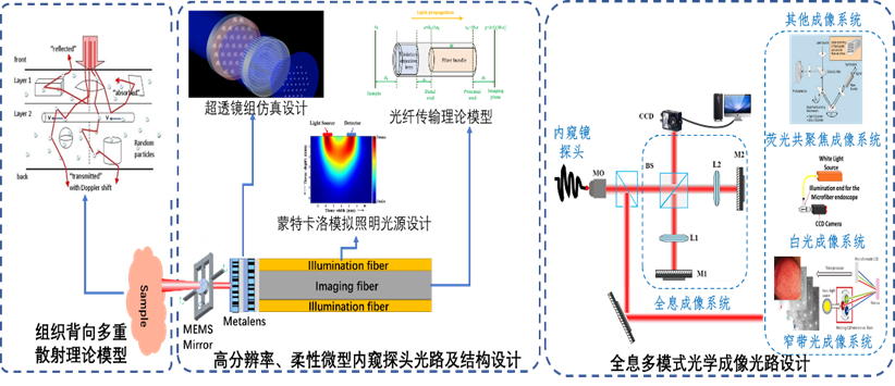 ②光纤式全息高清成像系统:蒙特卡洛模拟照明光在组织的传播路径和光能分布;利用Zemax软件仿真内窥镜探头的微物镜组,设计符合手术要求的微物镜尺寸;结合全息成像原理,设计??榛墓饴?,从而实现高清成像;将探头部分与成像部分灵活适配,具备显微技术优势的同时,保持探头的微小尺寸和便携性;
